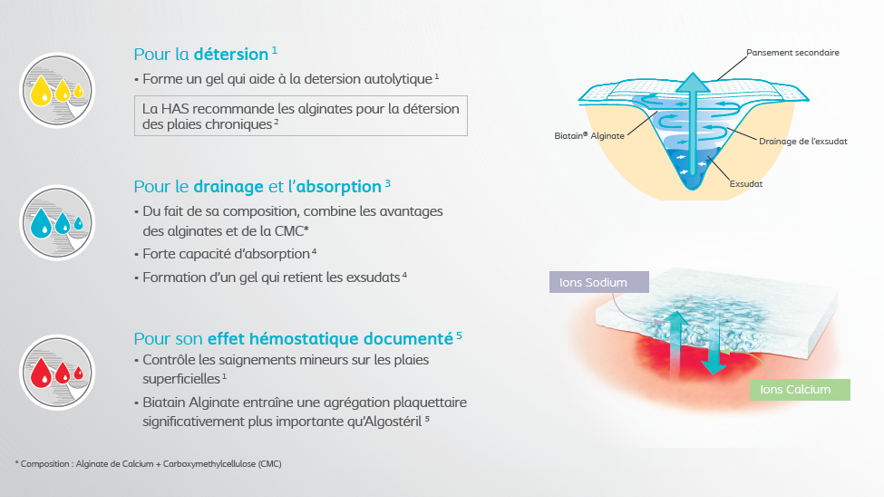 - HAS, BON USAGE DES TECHNOLOGIES MÉDICALES Les pansements 2011, Utilisation des alginates dans la détersion des plaies chroniques.