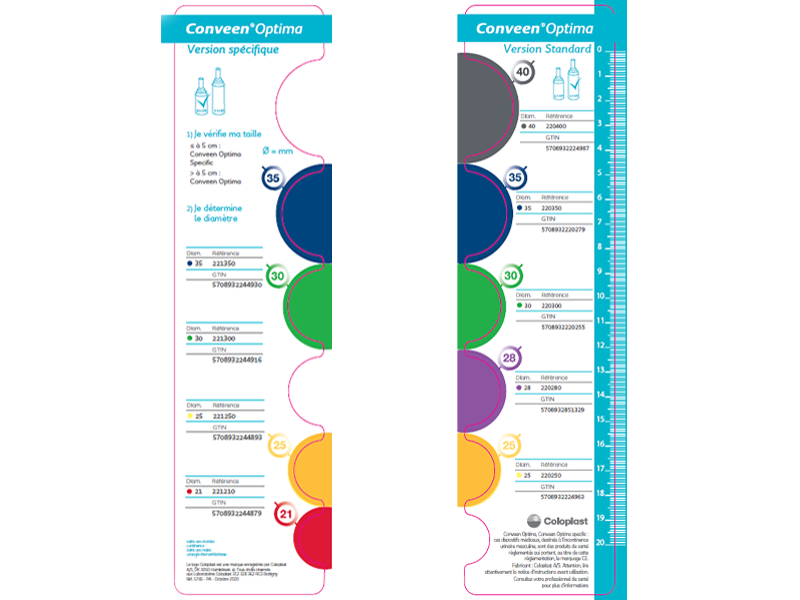 Le choix de la taille de l’étui est fondamental. Si le diamètre n’est pas adapté à celui de la verge, l’étui glisse et des fuites se produisent ou bien la verge s’irrite. Pour cela, le mesureur Conveen® Optima doit être utilisé.