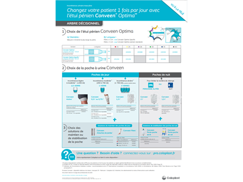 Conveen® Optima : dispositif médical destiné à l’incontinence urinaire masculine, de classe I, non stérile, marqué CE. Fabricant : Coloplast A/S. Lire attentivement la notice d’instructions avant utilisation. Produit intégralement remboursé LPPR pour les patients en ALD et pour les patients au régime général bénéficiant d’une couverture complémentaire. La prescription est réalisée par un médecin un infirmier ou par un kinésithérapeute. L’étui pénien peut être renouvelé quotidiennement ou plus fréquemment en cas de décollement du dispositif. Lors de la 1ère dispensation des étuis péniens, seule une boite de 1 ou une boite de 15 unités peut être délivrée.