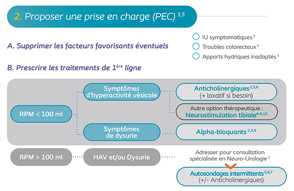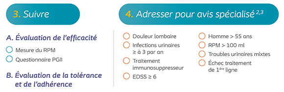 Les experts s’accordent sur l’importance du suivi. Il est donc important de suivre l’efficacité du traitement mis en place via des examens cliniques comme la mesure du RPM ou des questionnaires tels que le PGII. Si les traitements de premières lignes proposés ne suffisent plus, il est important d’adresser le patient vers un expert de neuro-urologie. Vous trouverez ci-dessous les autres « drapeaux rouges » nécessitant l’avis d’un spécialiste des troubles vésico-sphinctériens.