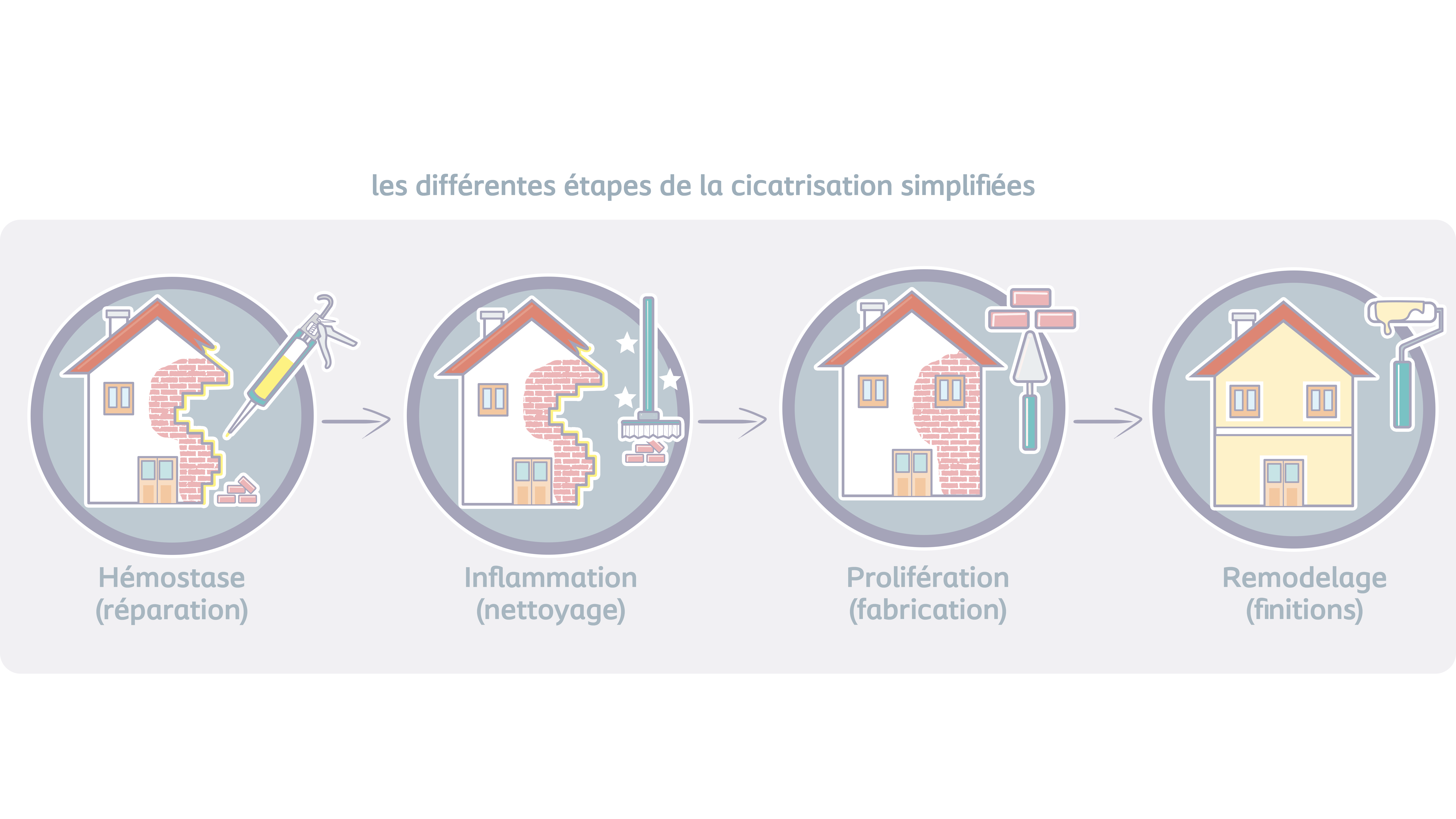 Certains auteurs comparent les différentes phases de la cicatrisation aux étapes d’un chantier de rénovation d’une maison. Ainsi, tout comme il est impossible de commencer certains embellissements avant d’avoir effectué le gros œuvre, il faudra attendre que toutes les étapes se mettent en place avant d’obtenir une résolution du processus cicatriciel. Et de la même manière que le processus de rénovation repose sur l’utilisation des bons matériaux devant être livrés sur le chantier au bon moment, la cicatrisation nécessite l’acheminement des bonnes cellules sur le site de la plaie, dans le bon ordre et au bon moment6.