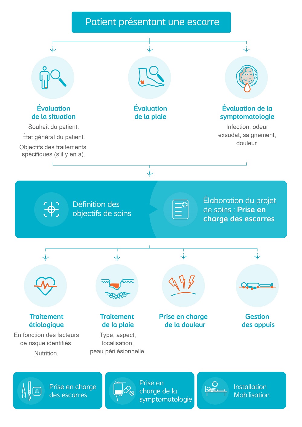 Chez les patients présentant une escarre, à la suite du bilan initial et à l’évaluation du risque, l’élaboration d’un projet de soins définissant les objectifs de soins est indispensable.