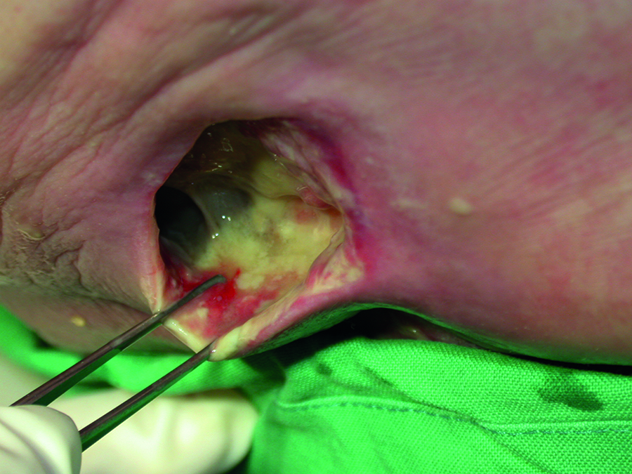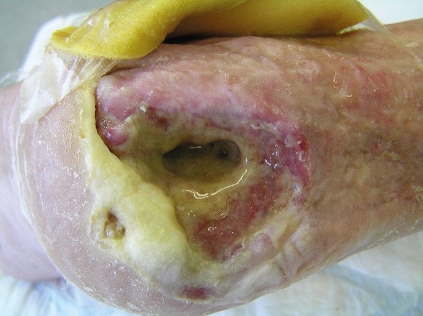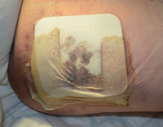 Le pansement primaire est saturé ; il est nécessaire de changer le pansement pour protéger les berges de la plaie et la peau périlésionnelle.