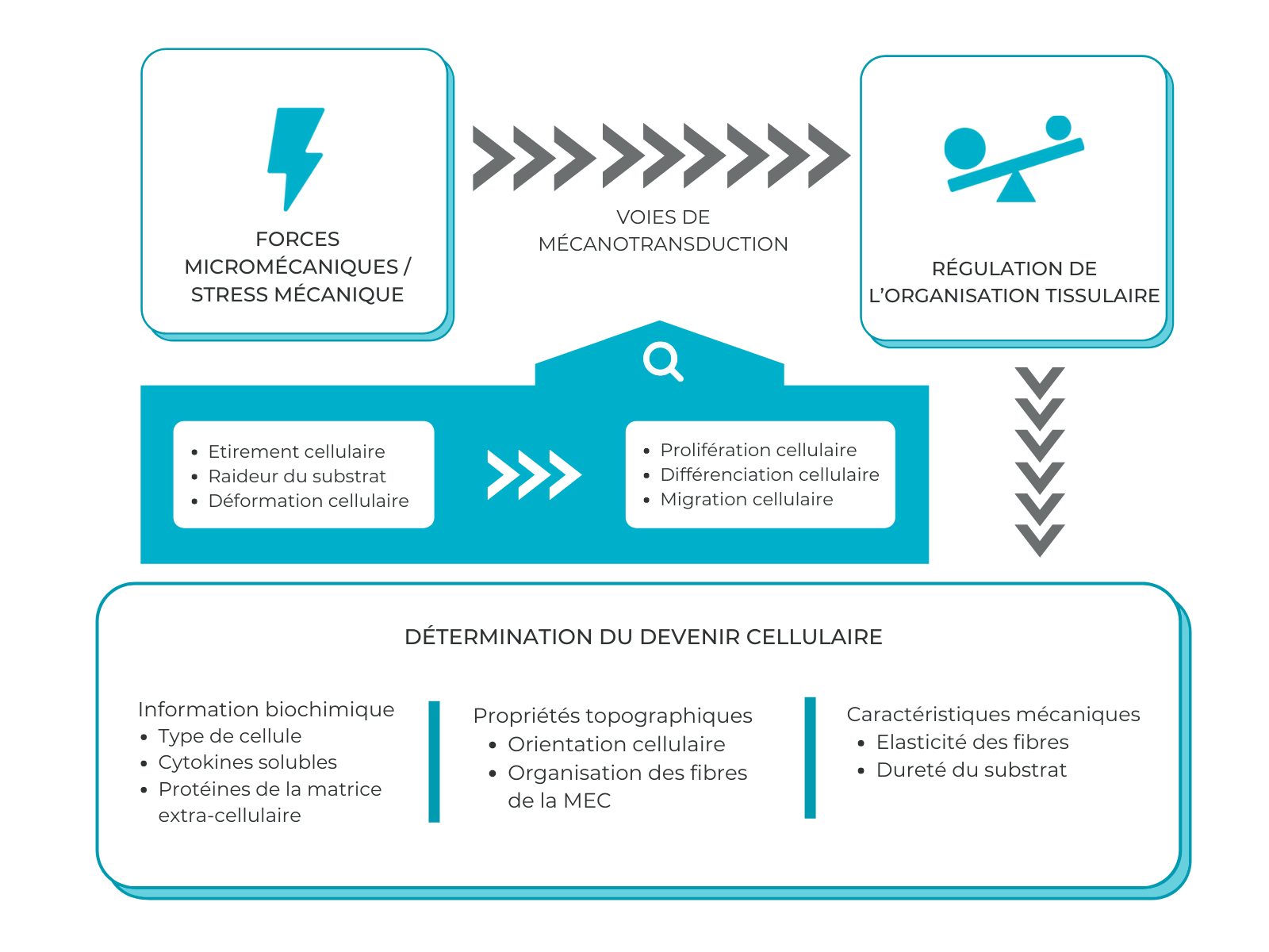 Les forces micromécaniques régulent l’organisation tissulaire via des voies de mécanotransduction. Le devenir des cellules est de ce fait déterminé par les signaux biochimiques, les propriétés topographiques du tissu et ses caractéristiques mécaniques5.