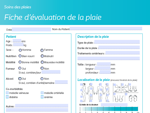 Cet outil permet d’évaluer toutes les zones clés (lit, berges, peau péri-lésionnelle) de la plaie et de prendre en compte les facteurs importants concernant le patient et son contexte qui ont une influence dans le processus de cicatrisation. Il vous aide également à fixer des objectifs de prise en charge clairs et à choisir un protocole de soin.