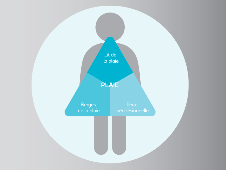 Il y a trois zones clés dans une plaie : le lit de la plaie, les berges de la plaie et la peau autour de la plaie – la peau périlésionnelle. Dans la prise en charge de tous les types de plaies, et en particulier les plaies chroniques, il est important d'évaluer toutes les zones de la plaie.