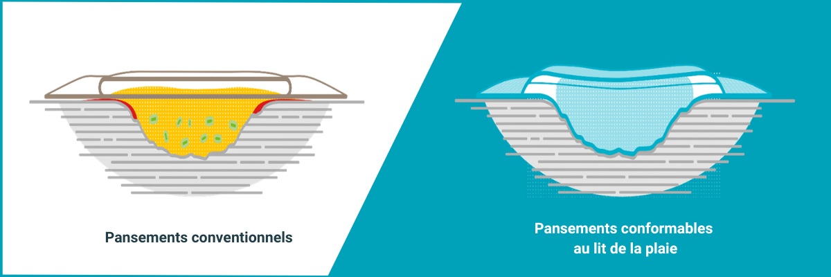 Se conforme au lit de la plaie pour réduire la formation des espaces morts et le risque d'accumulation des exsudats.1,2