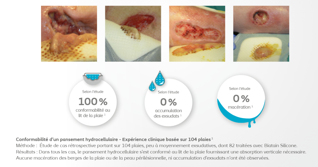 - Braunwarth H and Von Hallern B. Conformability of a foam dressing – clinical experience based on 104 cases. Wounds Poster. Harrogate, UK, 2017. Etude retrospective de 104 plaies dont 82 traitées par Biatain Silicone, en milieu hospitalier en Allemagne.