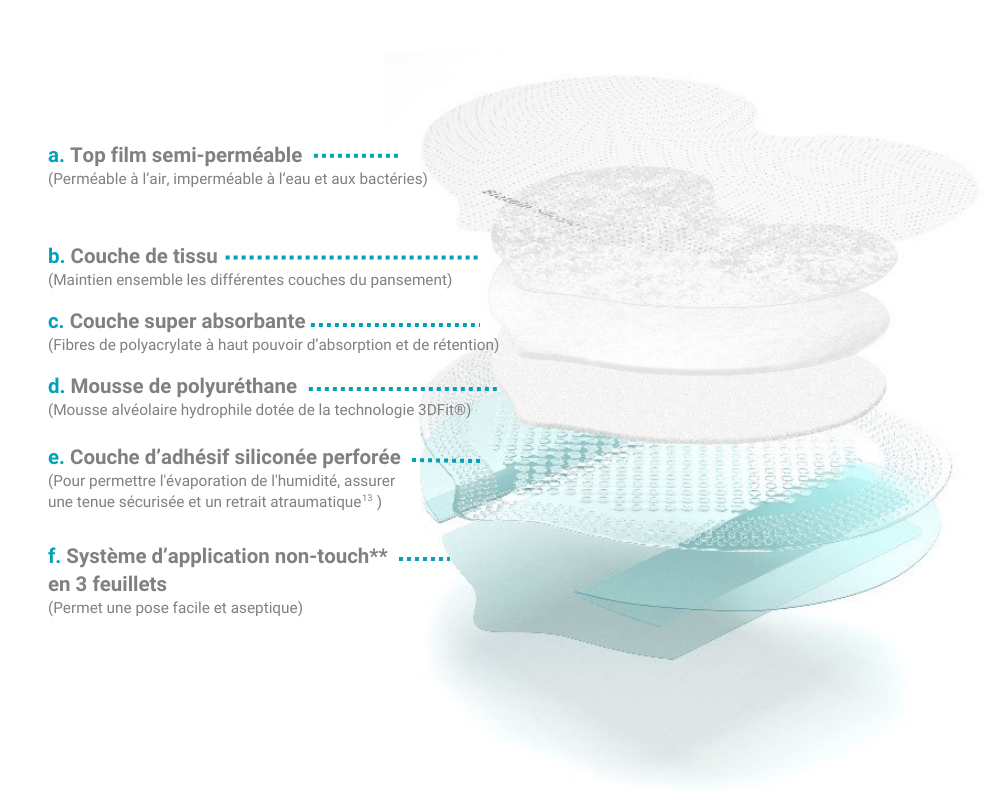 Biatain® Silicone est un pansement hydrocellulaire siliconé à absorption importante, composé de 5 couches et doté de la technologie 3DFit®.