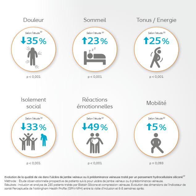 - Fromantin I, et al. Évolution de la qualité de vie dans l’ulcère de jambe veineux ou à prédominance veineuse traité par un pansement primaire hydrocellulaire siliconé. Poster présenté aux Journées Cicatrisation. Paris, FR, 2017. Étude prospective incluant 290 patients traités par Biatain Silicone et compression veineuse.