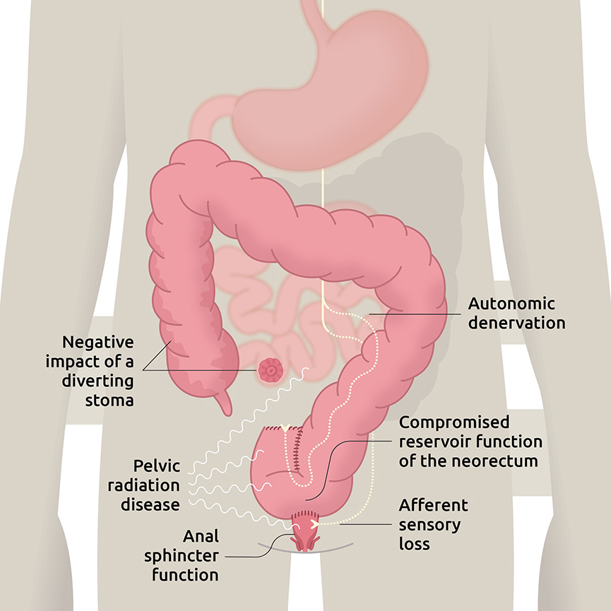 On pense que la résection chirurgicale du rectum et les propriétés physiologiques compromises du rectum nouvellement créé sont la principale cause du SRAB car elles sont à l’origine de modifications du fonctionnement du réservoir et d’une altération de l’évacuation5,6. La longueur du rectum restant est corrélée à de meilleurs résultats fonctionnels, bien que cet effet ne se retrouve pas chez les patients ayant préalablement reçu une radiothérapie avant la chirurgie dite radiothérapie néoadjuvant7. La perte sensorielle afférente provoque des troubles de la discrimination gaz/selles, qui nécessitent parfois des passages réguliers aux toilettes8. Une stomie temporaire de protection, réalisée pour prévenir les complications post-chirurgicales à type de fistules au niveau de l’anastomose, pourrait également augmenter le risque de développer un SRAB, bien que sur ce point les données soient contradictoires9-11. La dénervation parasympathique et sympathique augmente la motilité du côlon proximal et perturbe les signaux qui régulent le transit au niveau du côlon distal12.