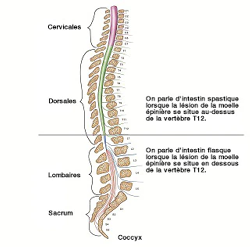 Les lésions médullaires représentent l’une des causes probables de l’intestin neurologique. Le lien entre troubles colorectaux et lésion médullaire dépend de l’emplacement et de la gravité de la lésion (comme indiqué ci-dessus).